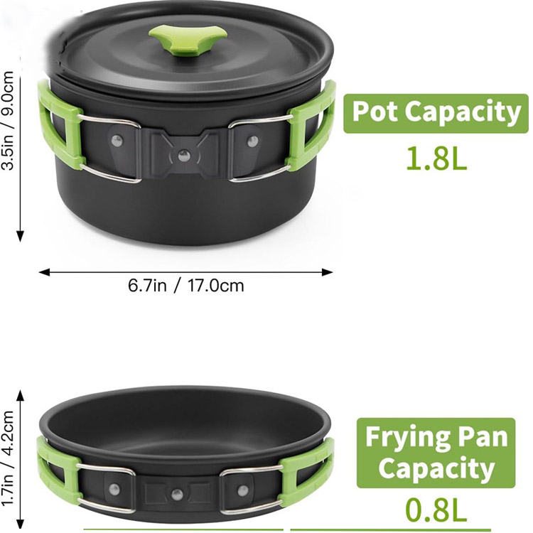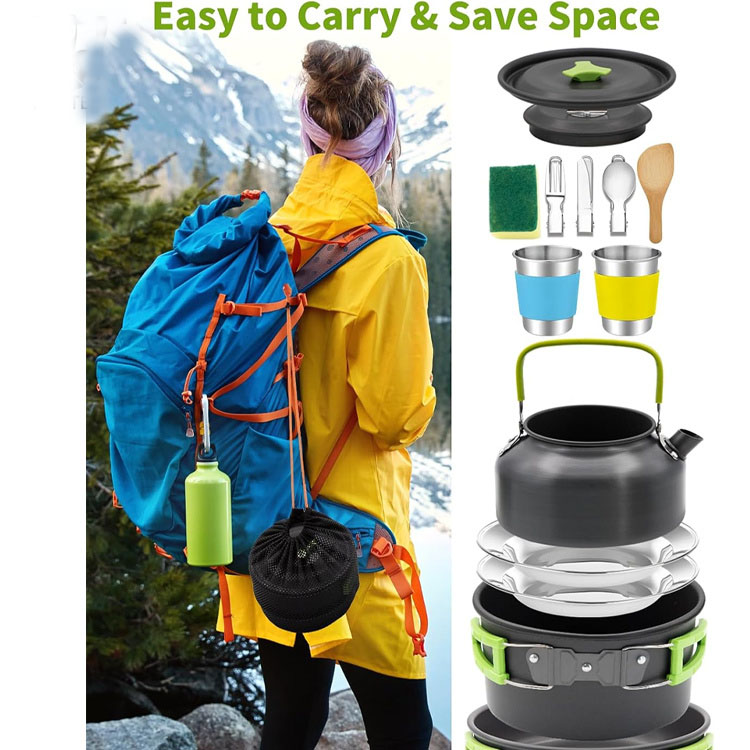 ชุดอุปกรณ์ที่ครอบคลุมนี้ประกอบด้วยทุกสิ่งที่จำเป็นสำหรับมื้ออาหารนอกบ้าน: หม้อ กระทะ ถ้วย จาน ส้อม มีด และช้อน ถือเป็นอุปกรณ์ครัวที่สมบูรณ์แบบสำหรับการผจญภัยแคมป์ปิ้ง