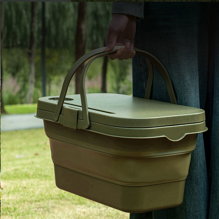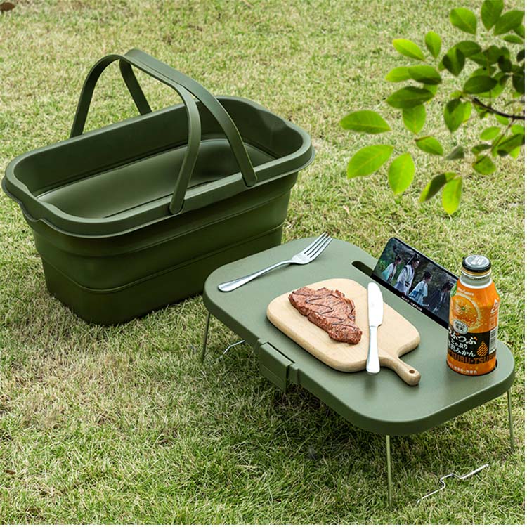 ตะกร้ากลางแจ้ง แคมป์ปิ้ง เดินป่า ปิคนิค ภาชนะเก็บ โซลูชันองค์กรแบบพกพาขั้นสูงสุดสำหรับการผจญภัยกลางแจ้ง ตะกร้าพับได้อเนกประสงค์นี้รวมคอนเทนเนอร์ที่มีพื้นผิวโต๊ะในตัว ผลิตจากพลาสติกที่ทนทาน เหมาะสำหรับการตั้งแคมป์ เดินป่า และปิกนิกนอกบ้าน
