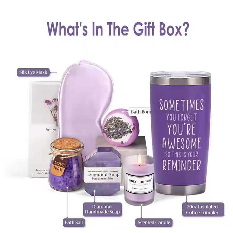 กล่องของขวัญ Lunaaire แต่ละกล่องประกอบด้วยสิ่งของต่างๆ ที่เข้ากันอย่างสวยงาม เช่น แก้วน้ำสแตนเลส เทียนอโรมาเธอราพี สบู่รูปเพชร ดอกไม้แห้ง และการ์ดอวยพร ชุดของขวัญพร้อมมอบนี้ช่วยให้คุณประหยัดเวลาพร้อมมอบประสบการณ์ที่จริงใจและสมบูรณ์แบบสำหรับทุกโอกาส