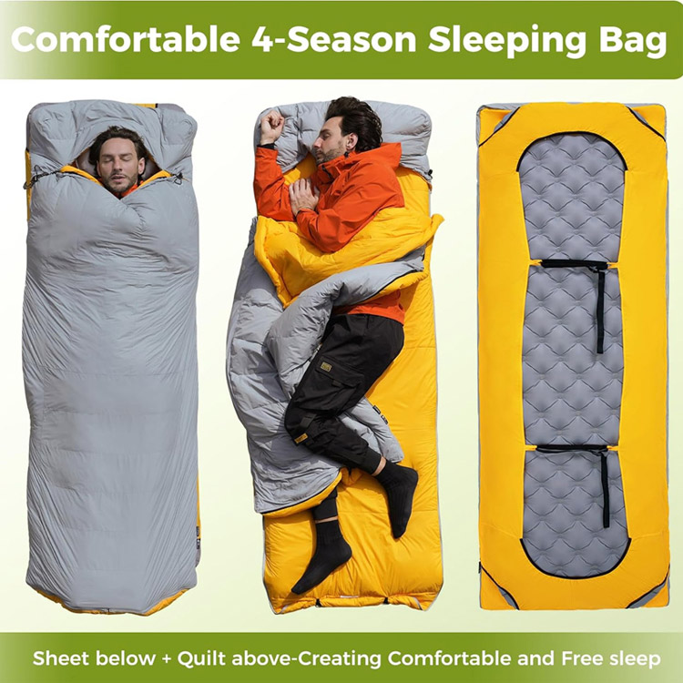เปลี่ยนจากกระเป๋ามัมมี่แบบดั้งเดิมเป็นผ้าปูทับอเนกประสงค์ได้อย่างง่ายดายโดยใช้ซิปแยกความยาวเต็มตัว รองรับรูปแบบการนอนที่แตกต่างกัน และให้การปกปิดที่ยืดหยุ่นในช่วงอุณหภูมิที่เปลี่ยนแปลงได้